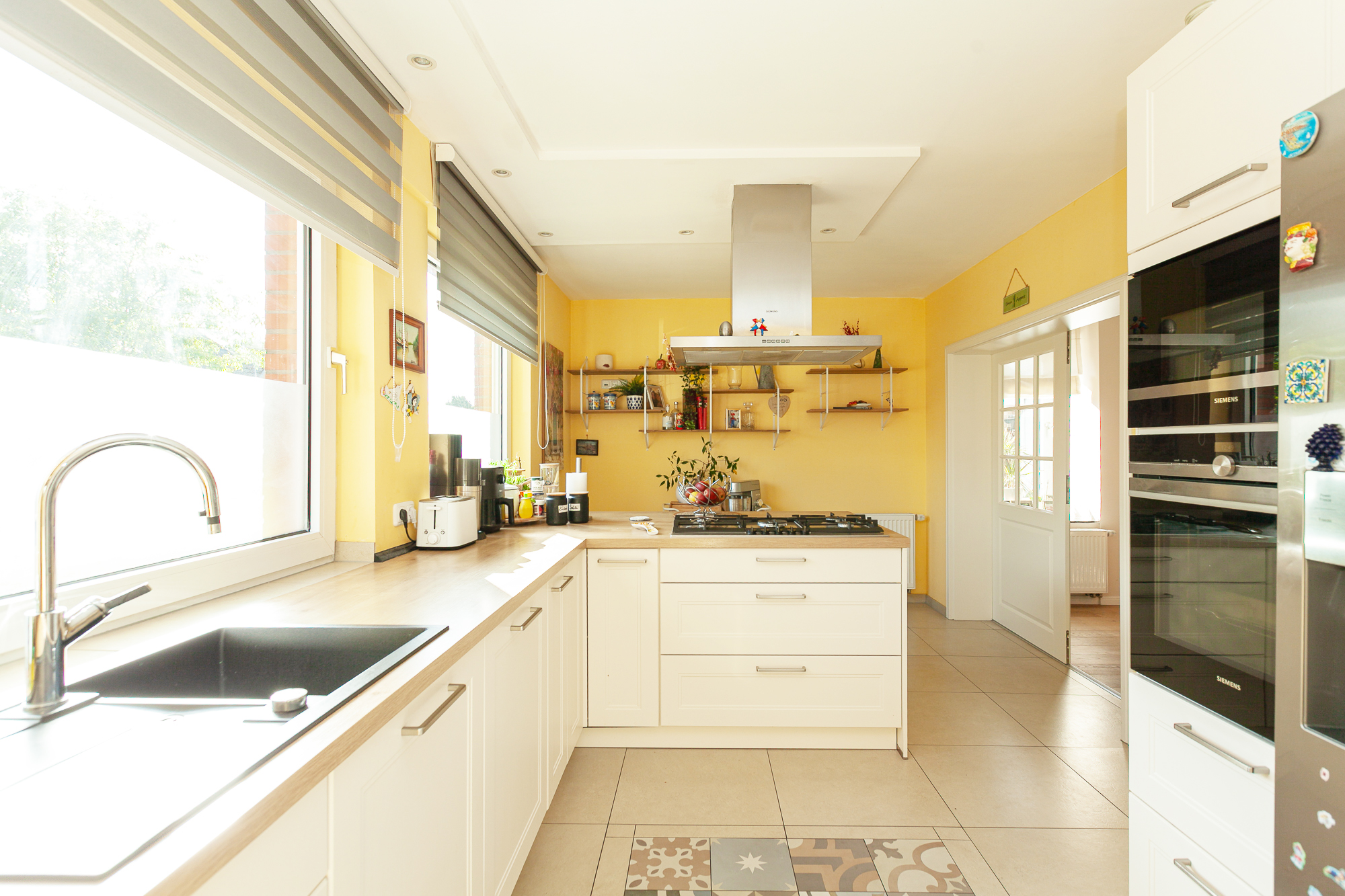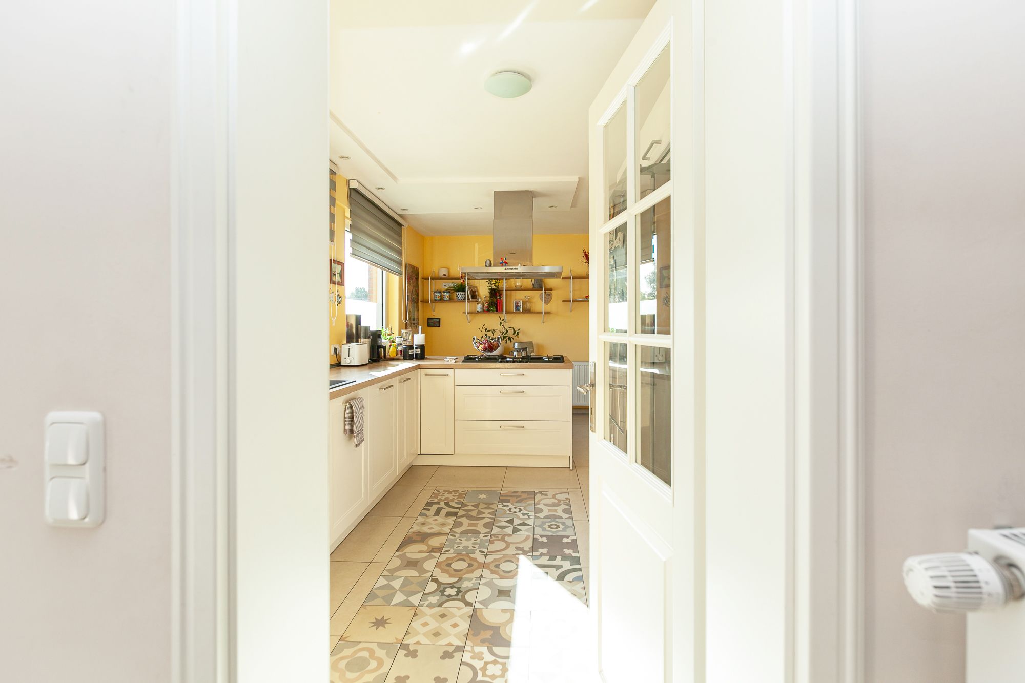 – Küche und Diele: Feinsteinfliesen (in der Küche mit Ornament)