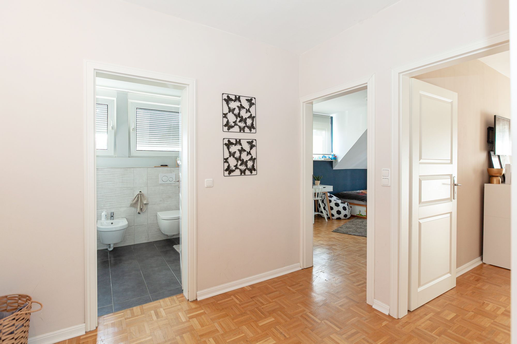 – Diele, Schlafzimmer, 1. Kinderzimmer, 2. Kinderzimmer: Stabholzparkett