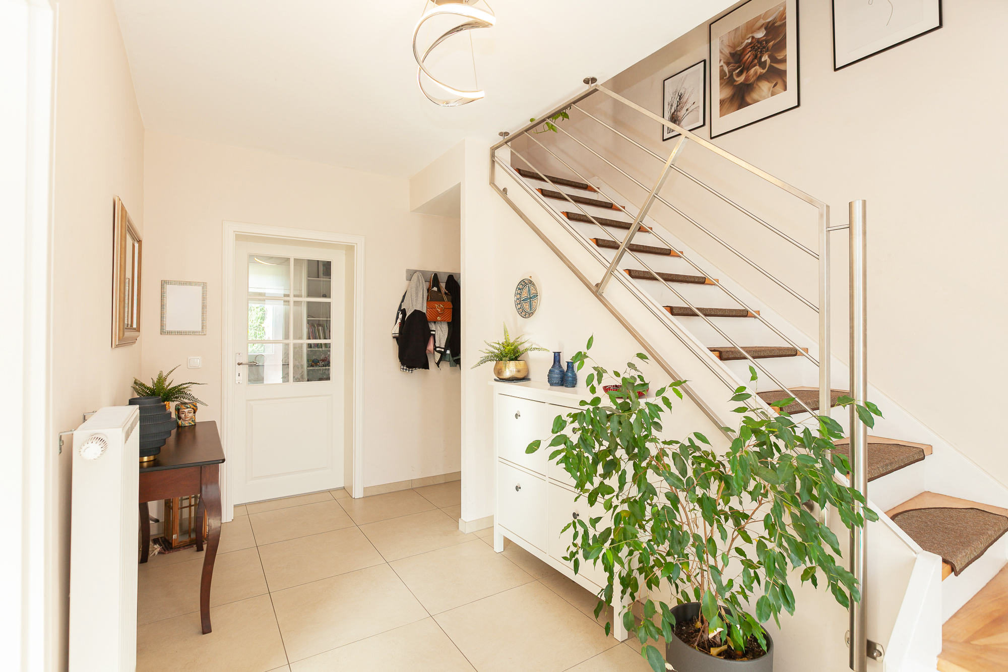 – hochwertige Treppe vom EG bis ins DG, weiß mit Holzstufen, Geländer und Handlauf aus Edelstahl