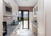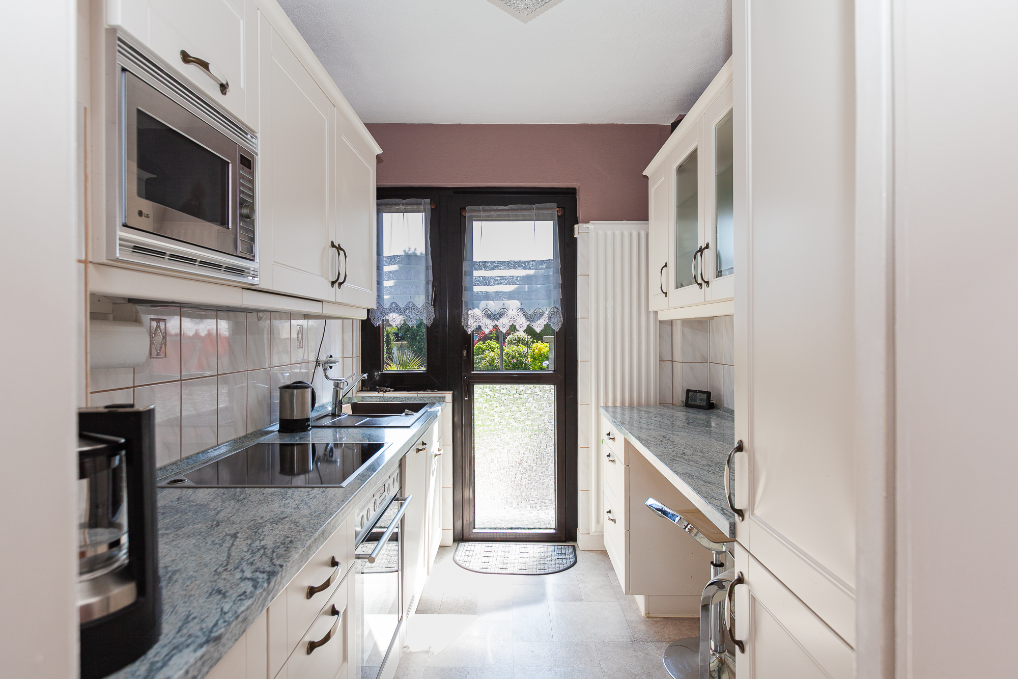 – Küchenbereich inklusive Einbauküche (creme) mit Zutritt zur großen Sonnenterrasse