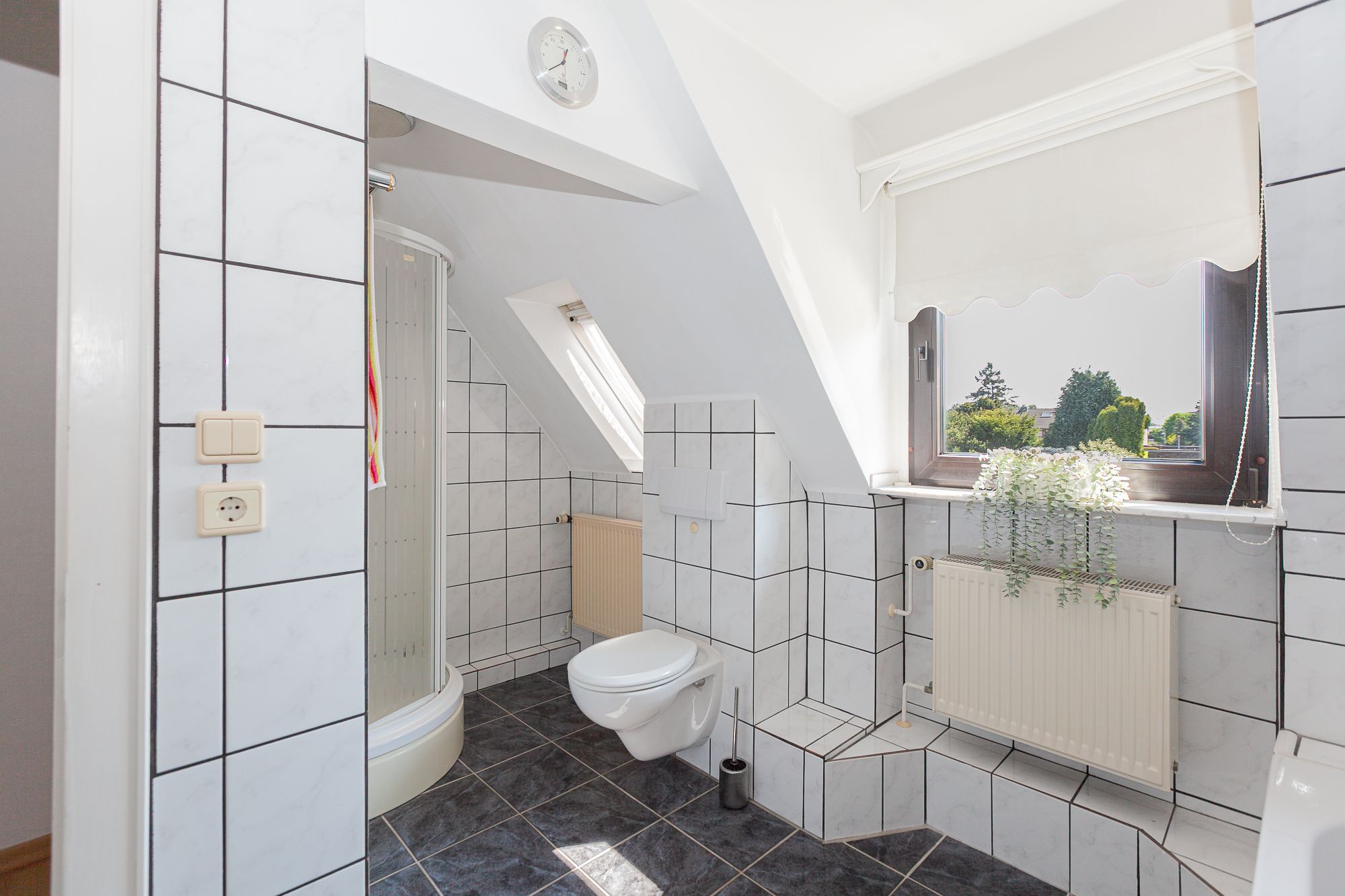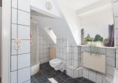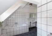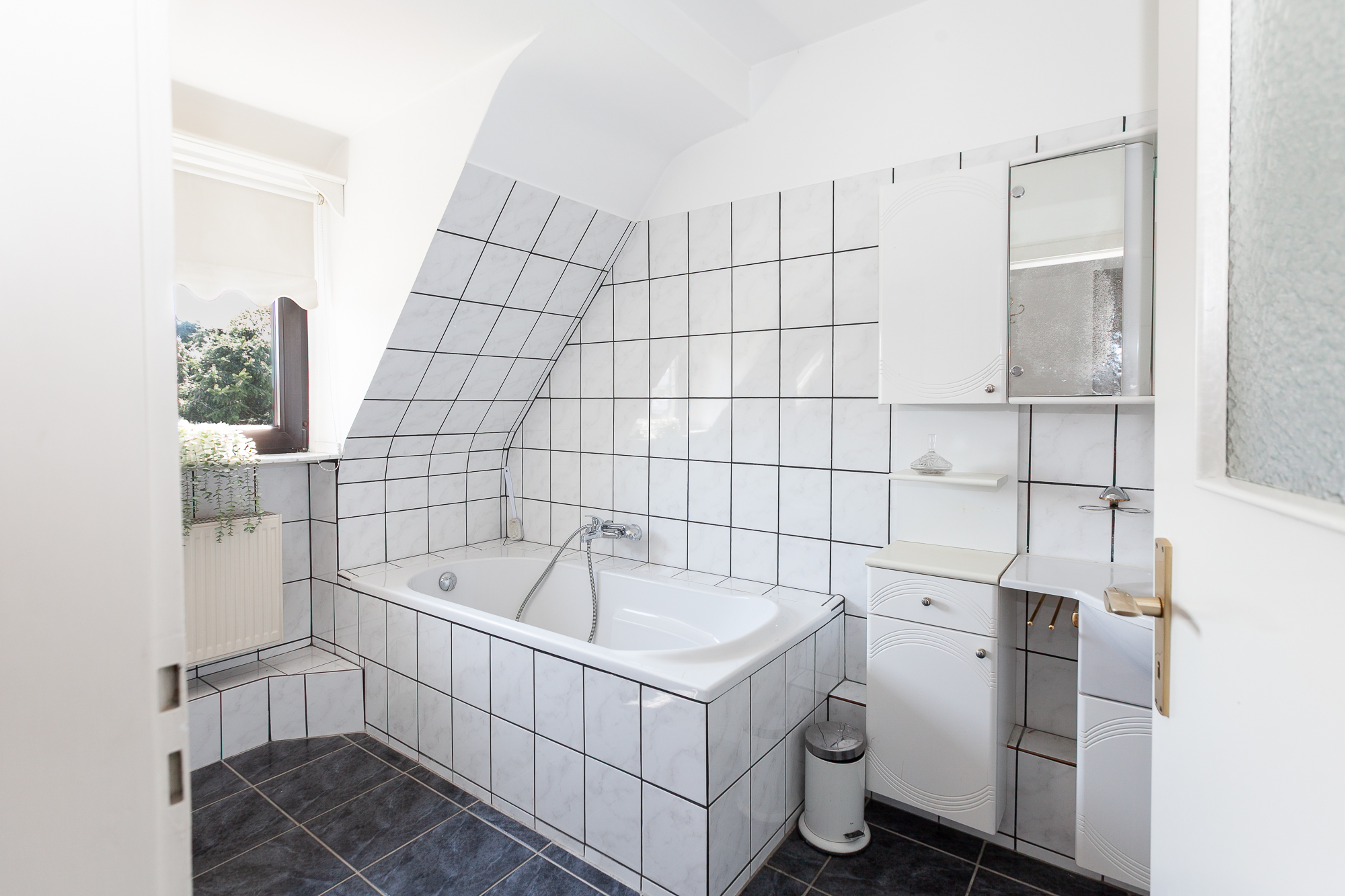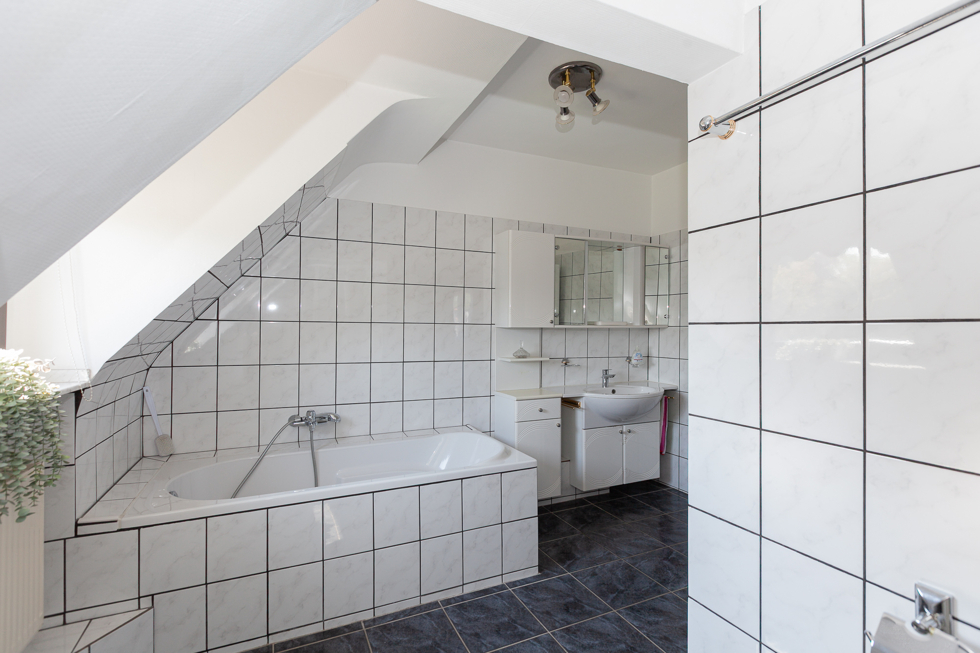– Tageslicht-Bad im 1. OG mit 2 Fensterelementen sowie separater Wanne und Dusche (Fliesen: weiß/hellgrau)